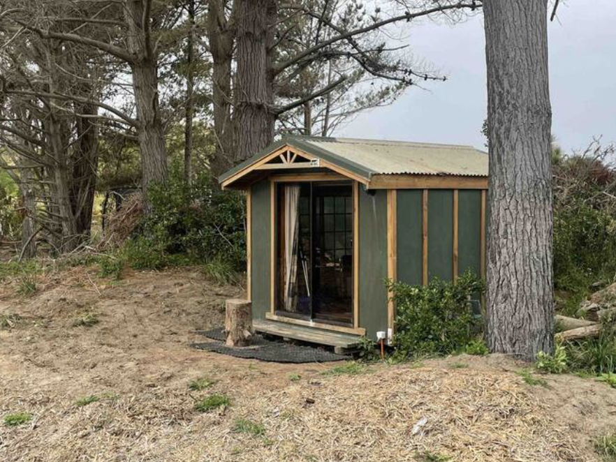 This tiny cabin on the left corner of the section is the cosiest cabin and nestled in native planting. It is around 10m2 and has two single beds that can be pulled together to make a king size bed. There is space for two more beds underneath (but best for kids or growns ups who aren’t claustrophobic) so can sleep 4 people. Fully kitted out (fridge, pots/pans/cutlery etc, heater, portable stove top, microwave, blueetooth stereo etc).